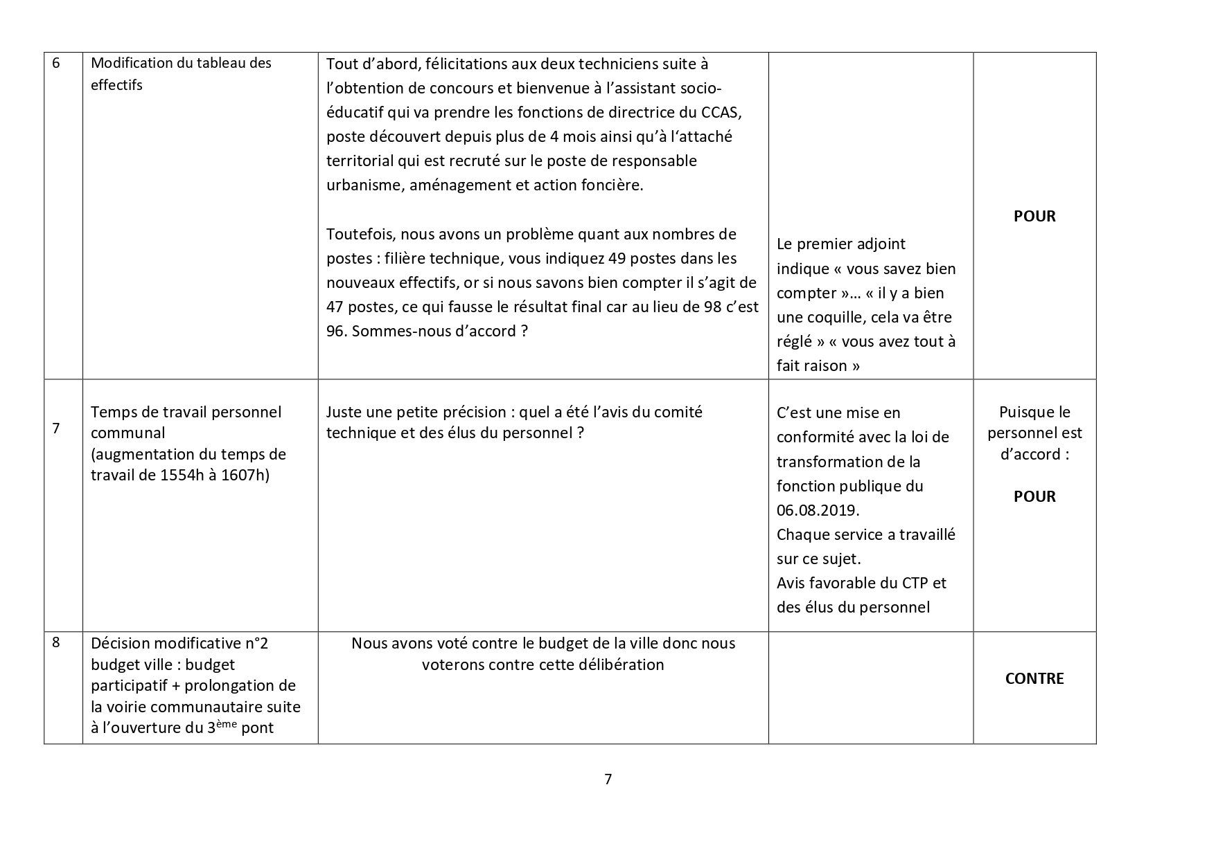 - TEMPS DE TRAVAIL du personnel : il a été augmenté (de 1554h à 1607h) conformément à la loi. Le 1er adjoint a indiqué que chaque service avait travaillé sur ce sujet et que les élus du personnel ont voté pour lors du comité technique