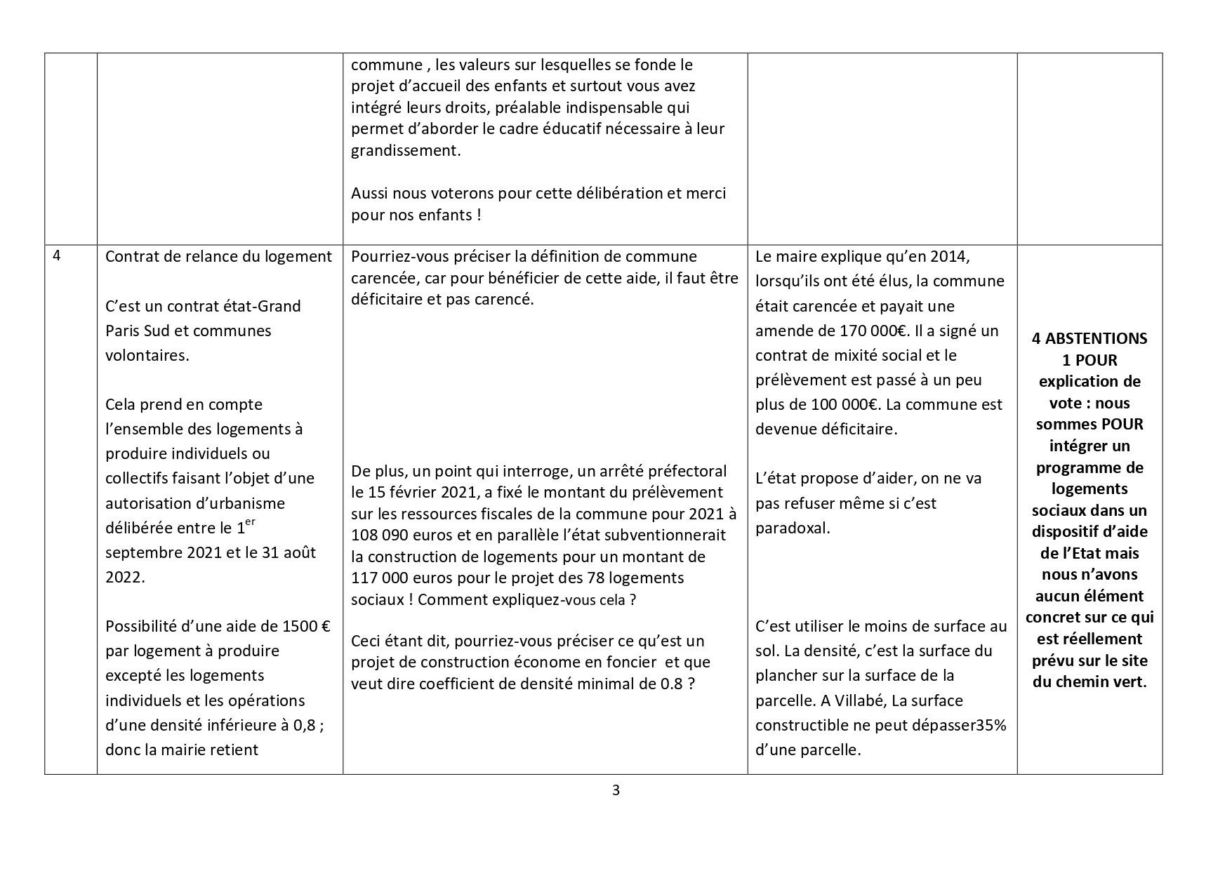 Bien vivre à Villabé est pour le dispositif d’aide mais n’a aucun élément concret sur ce qui est prévu rue du chemin vert et n’a pas été convaincu par les explications du maire qui affirme ne pas avoir d’autres éléments quant au projet d’ERILIA, en dehors d’un nombre de logements qu’il estime à 78.