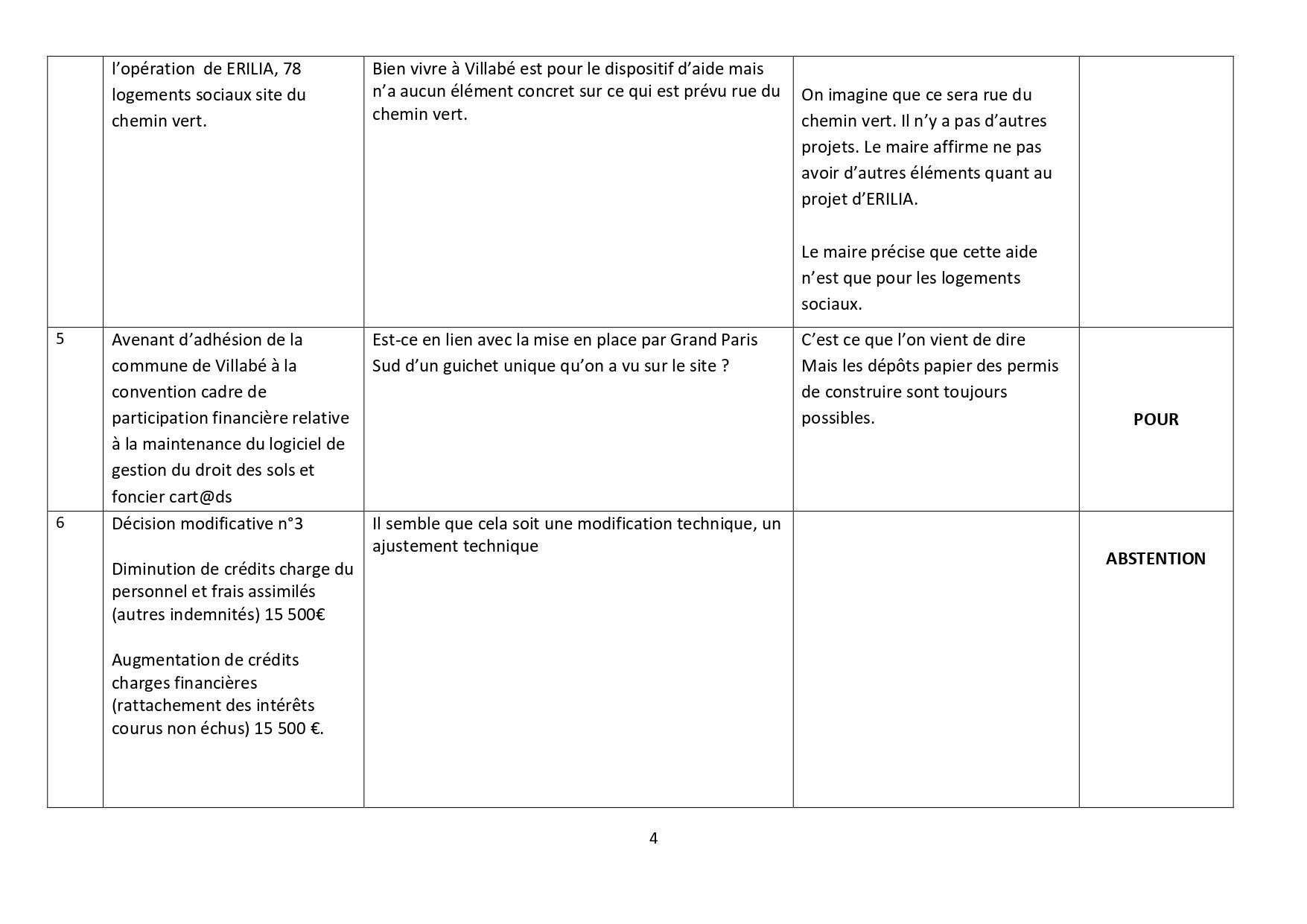 Vote des conseillers municipaux de Bien vivre à Villabé : 4 abstentions, 1 pour