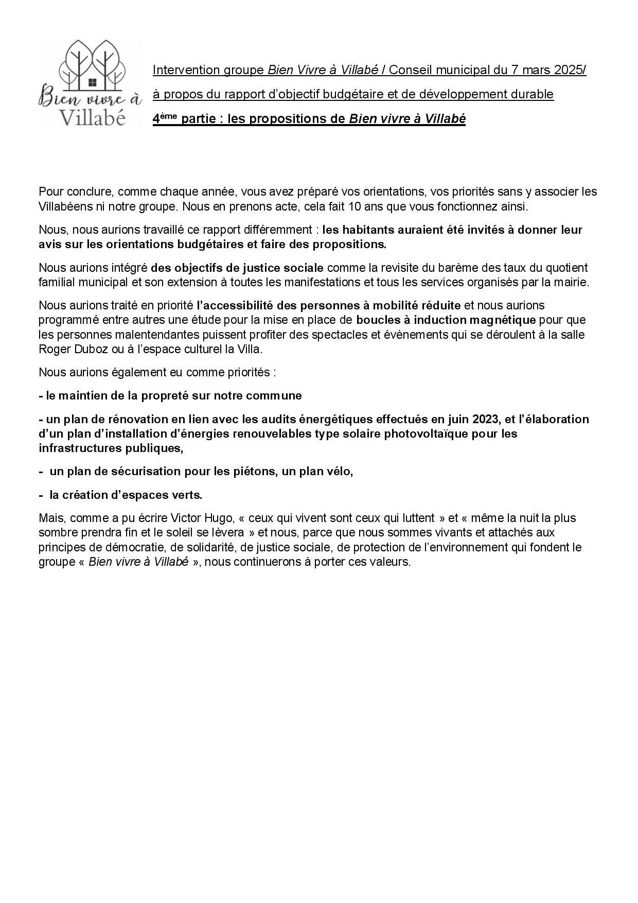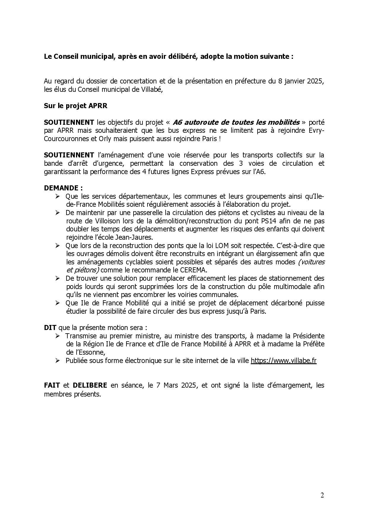 Le groupe Bien vivre à Villabé est conscient des enjeux de ce projet. Lors de la présentation de cette motion, il a demandé que soient ajoutés trois points dans les demandes :