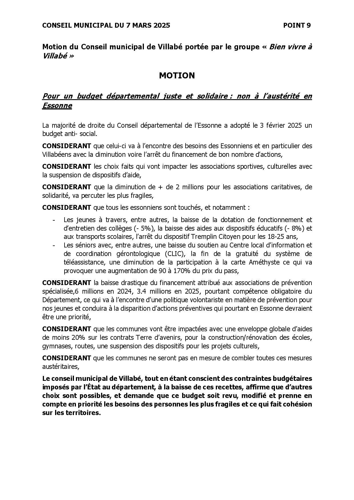 Cependant, tout en étant conscients des contraintes budgétaires subies par le conseil départemental de l’Essonne, nous proposons cette motion pour demander que le budget voté soit revu, modifié et prenne en compte en priorité les besoins des personnes les plus fragiles et ce qui fait cohésion sur les territoires.