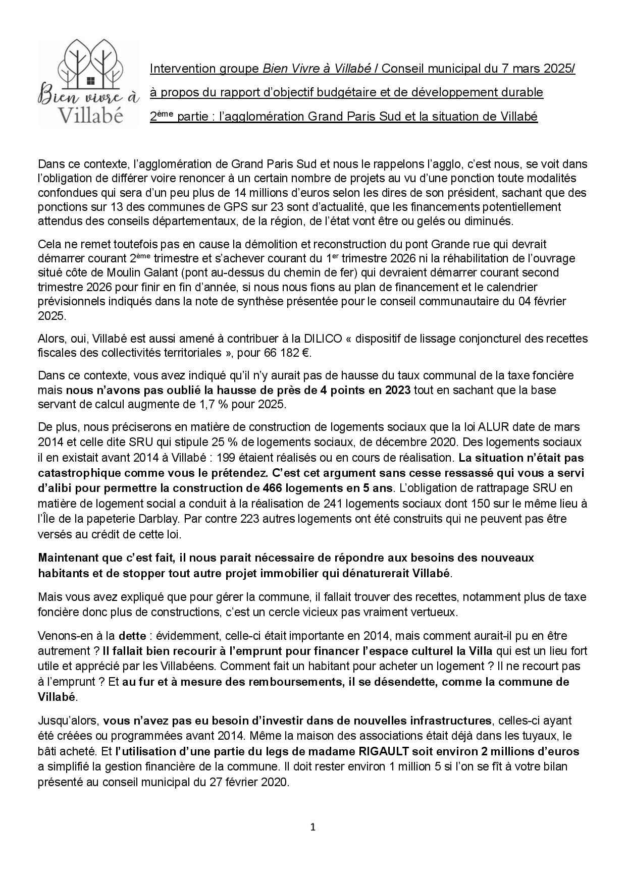 Voici donc l’intervention des conseillers municipaux de Bien vivre à Villabé :