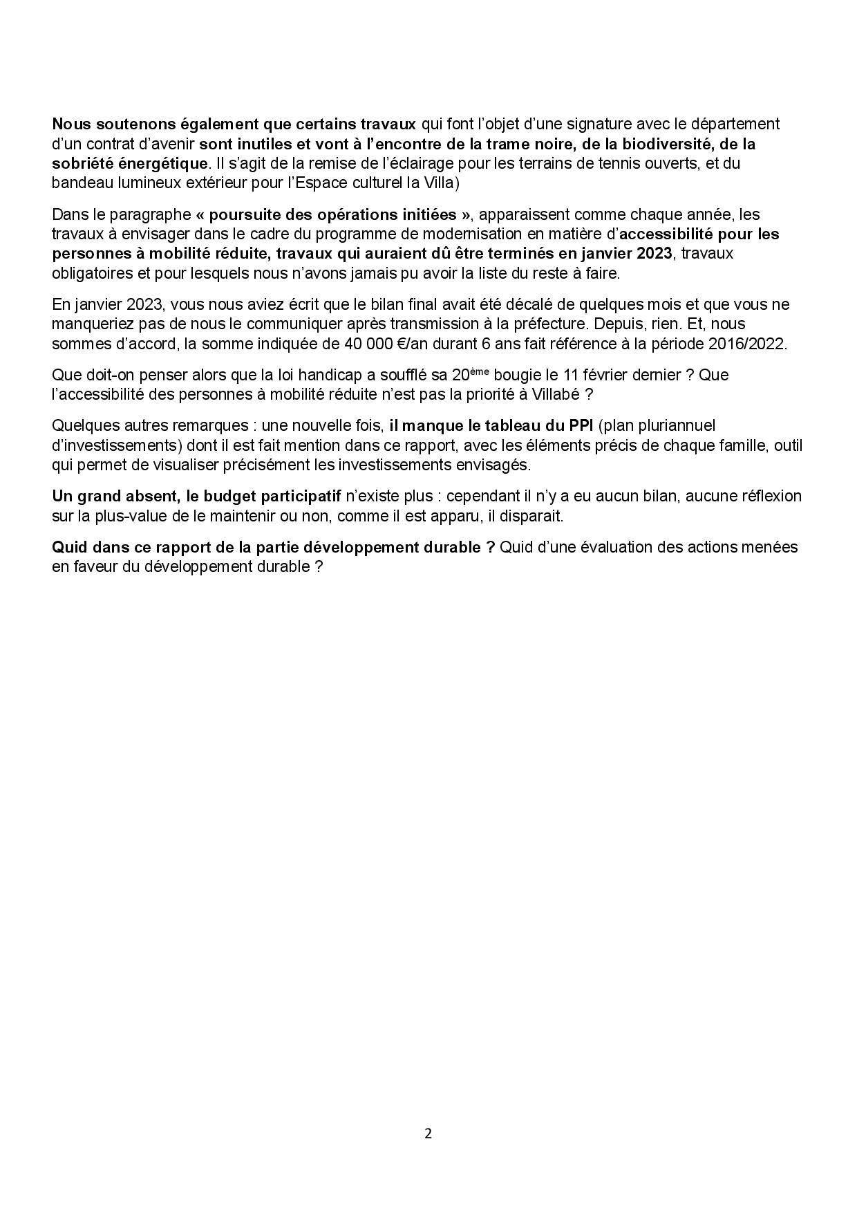 Les conseillers municipaux de Bien vivre à Villabé ont pourtant argumenté en expliquant que d’autres choix étaient possibles, faisant référence à un nouvel apport évalué à 9 millions qui n’était pas inscrit dans le budget lors de son vote et qui peut donc servir à revoir en partie les décisions prises.
