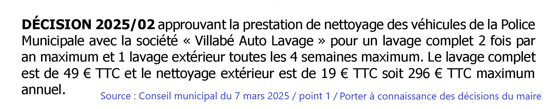 Le maire, en accord avec l’équipe majoritaire, a pris une décision approuvant la prestation de nettoyage des véhicules de la Police Municipale avec une société privée de février à décembre 2025.