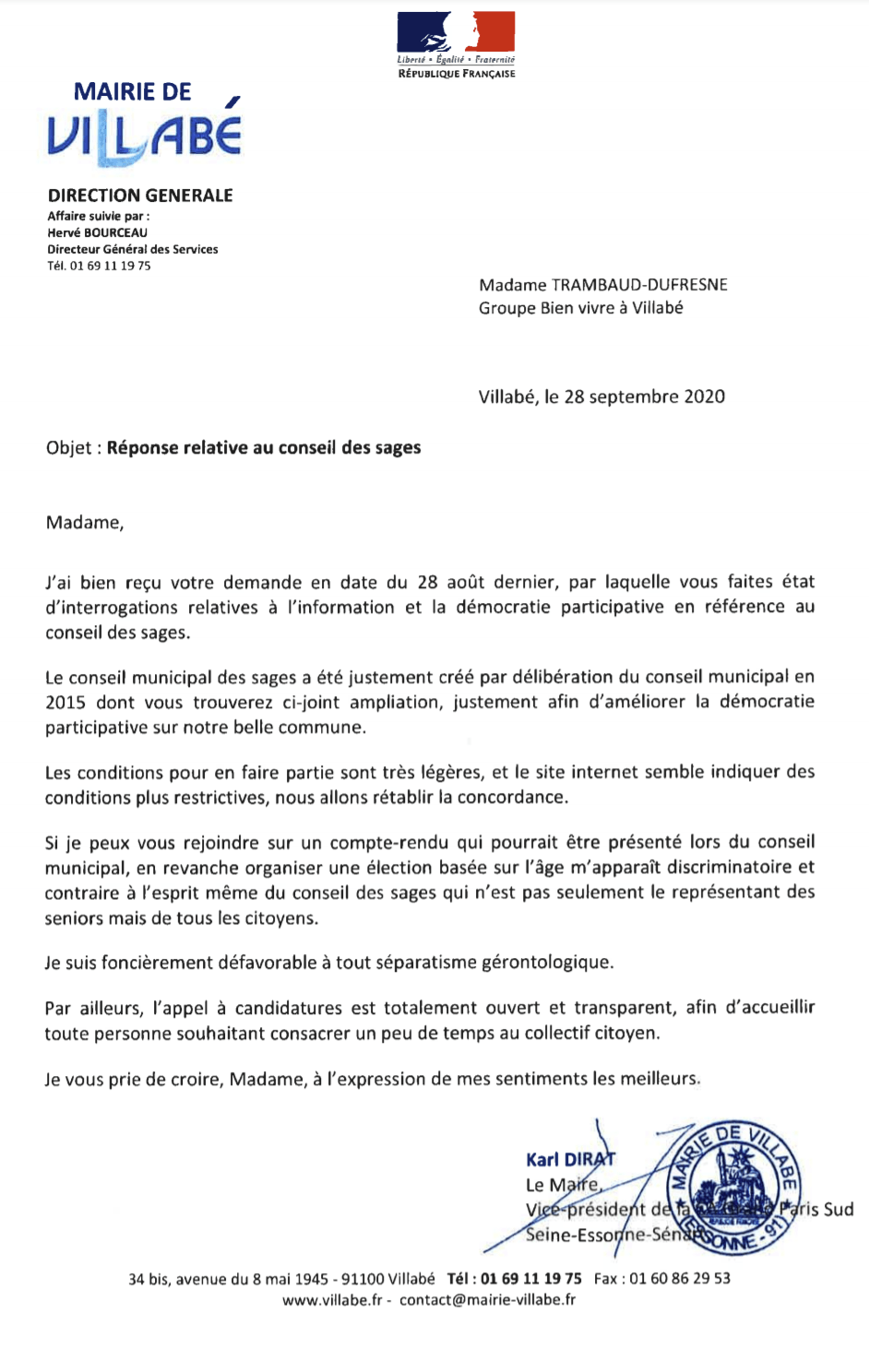 - « Organiser une élection basée sur l’âge m’apparait discriminatoire et contraire à l’esprit même du conseil des sages qui n’est pas seulement le représentant des séniors mais de tous les citoyens » : évidemment, il vaut mieux que ce soit le maire qui décide et ... si le conseil des sages représente tous les citoyens, à quoi servent les élections municipales ? Est-ce cela la démocratie ?