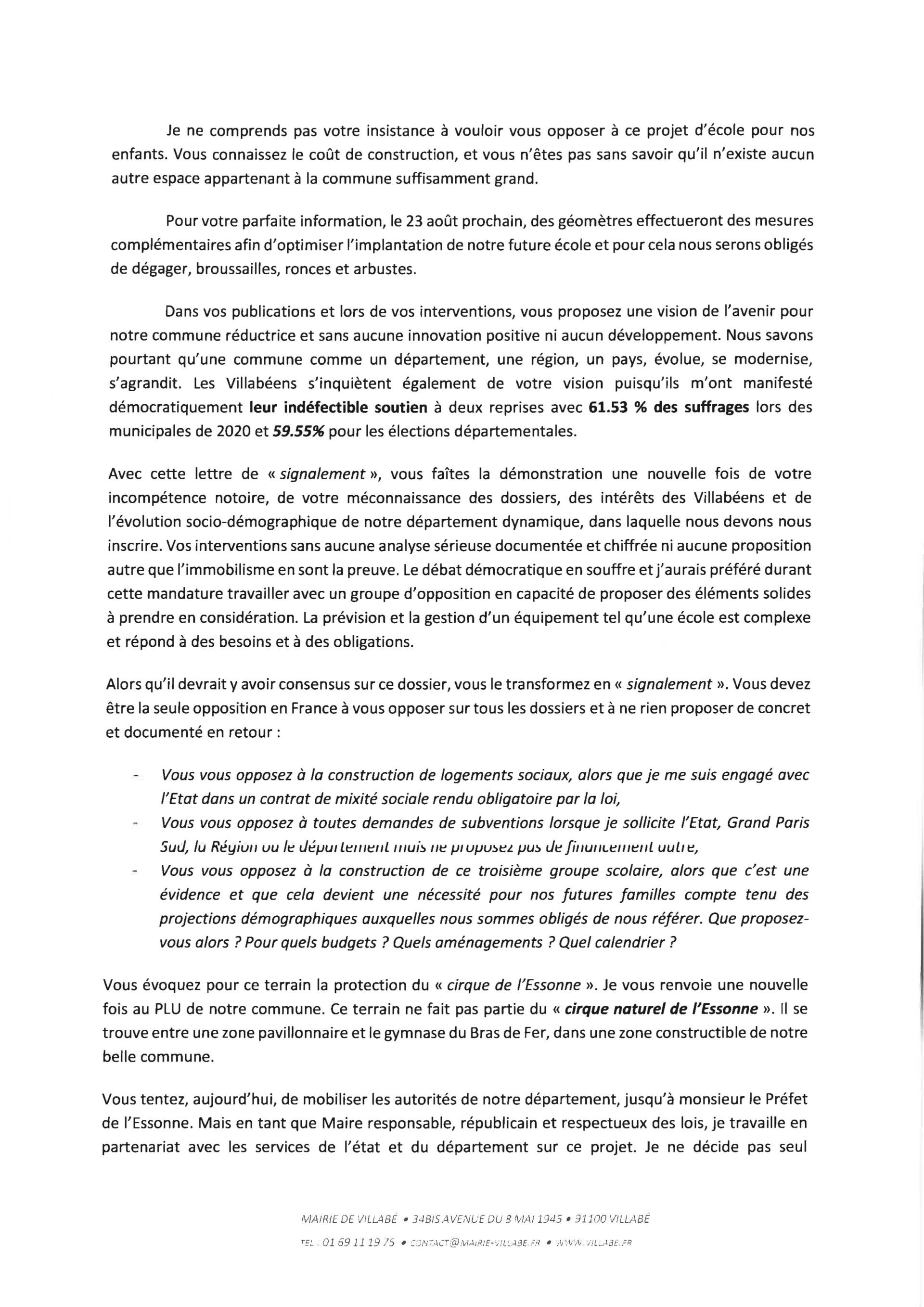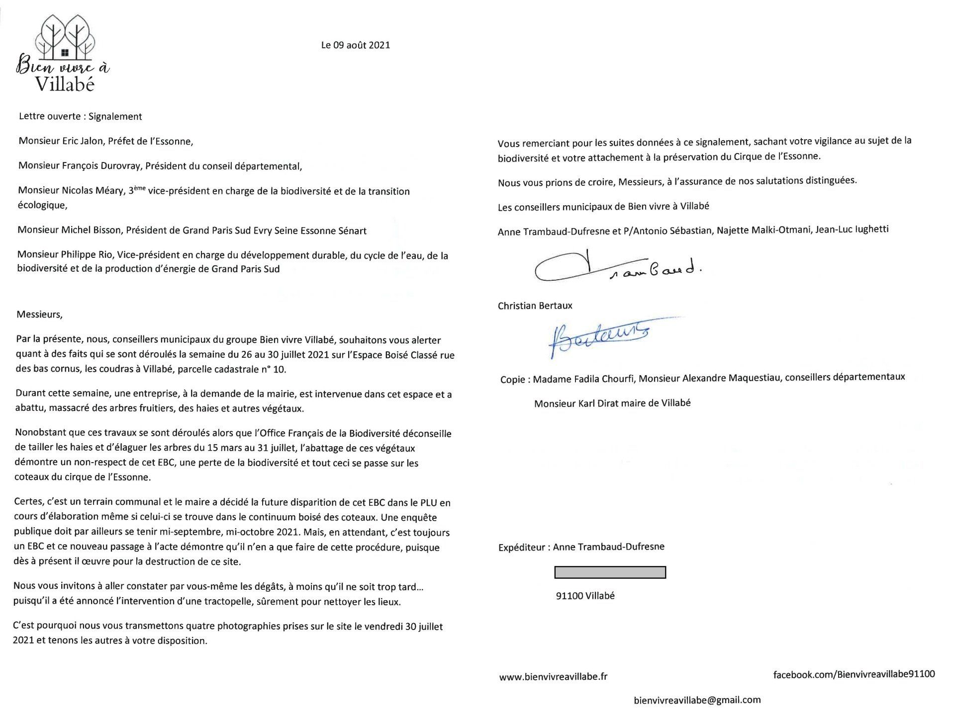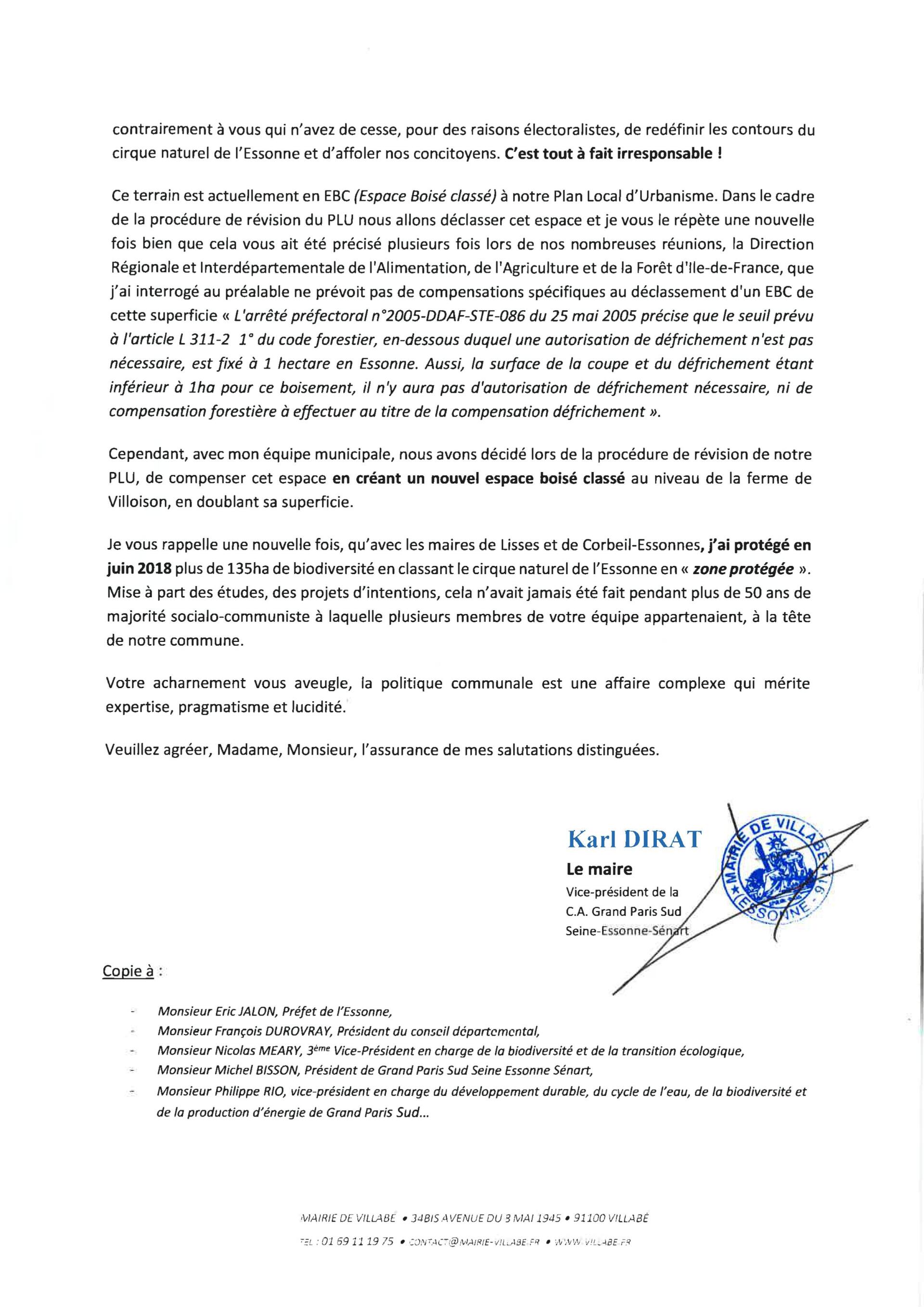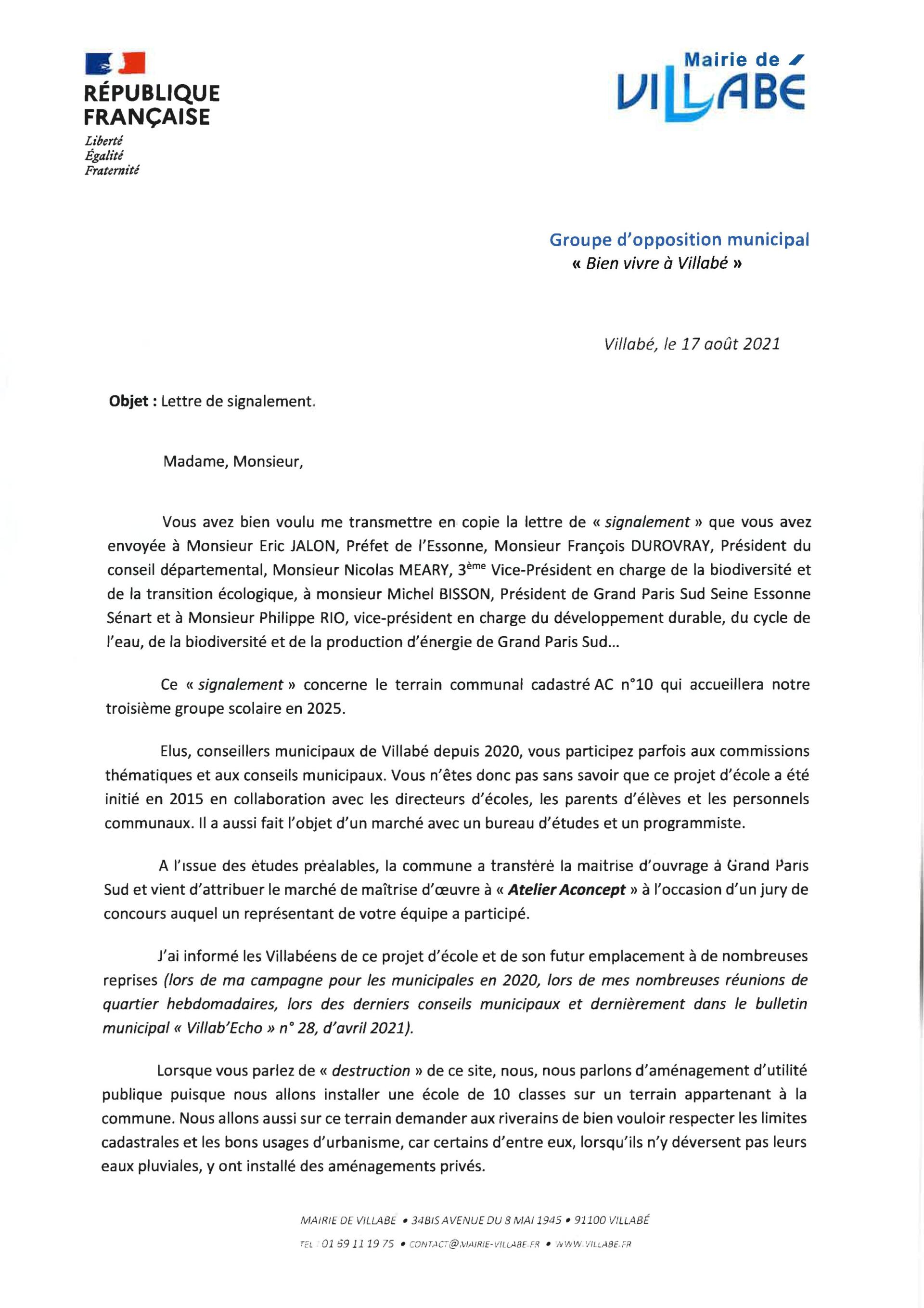 Reçue lettre du maire suite au signalement transmis au préfet, au président du conseil départemental, au président de l’agglomération, signalement dont il a eu une copie pour information car le groupe Bien vivre à Villabé continue à appliquer le principe de transparence !