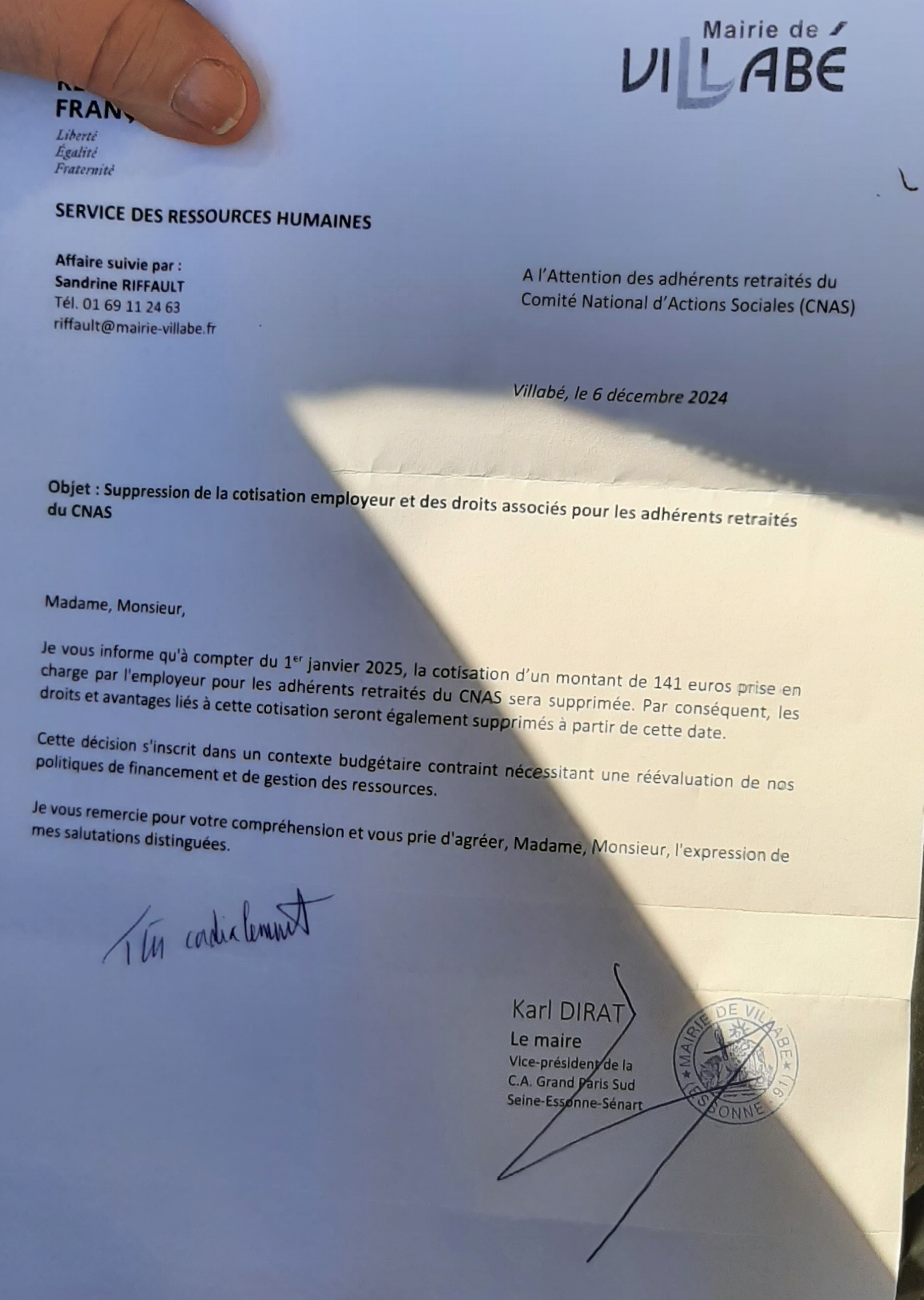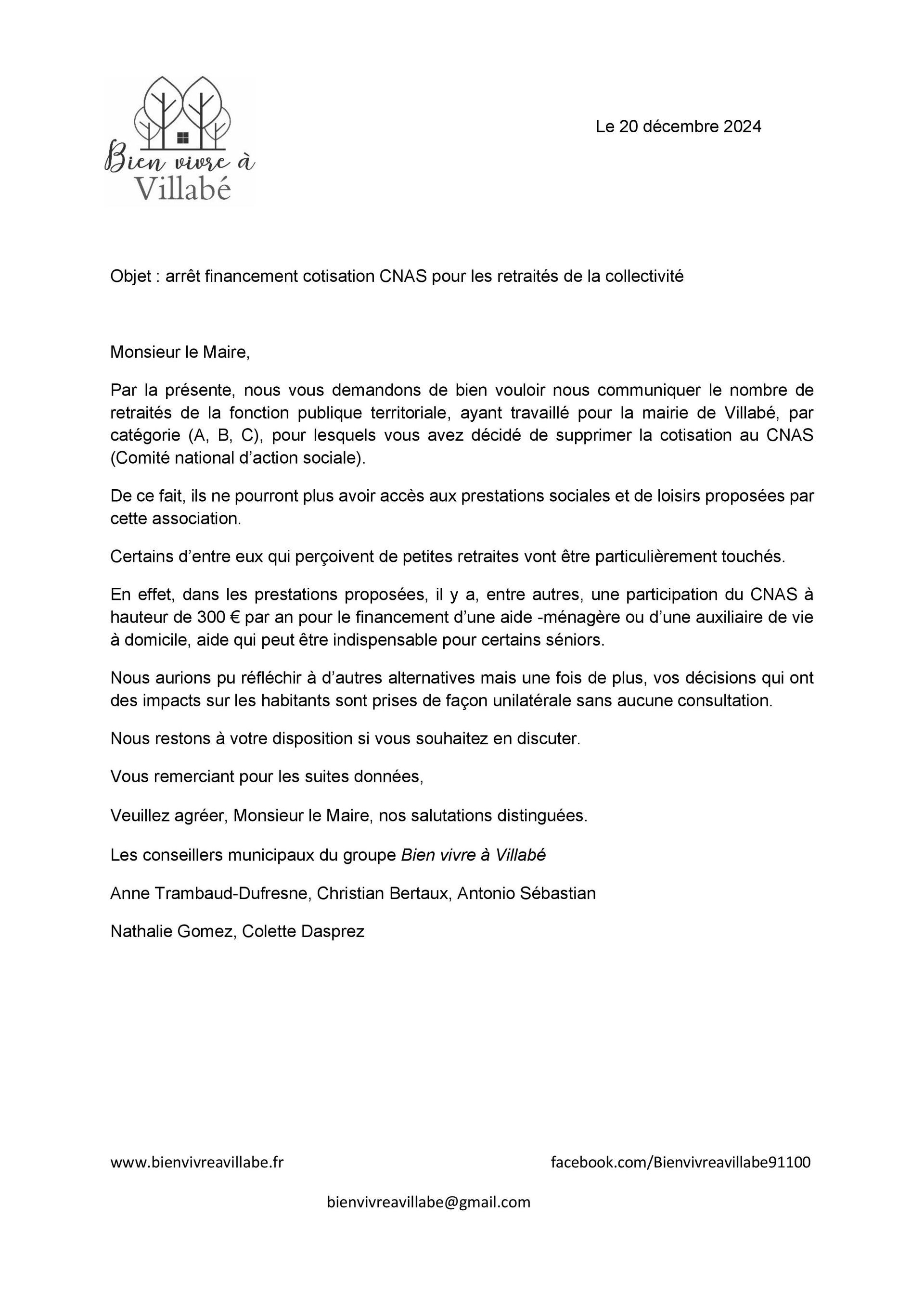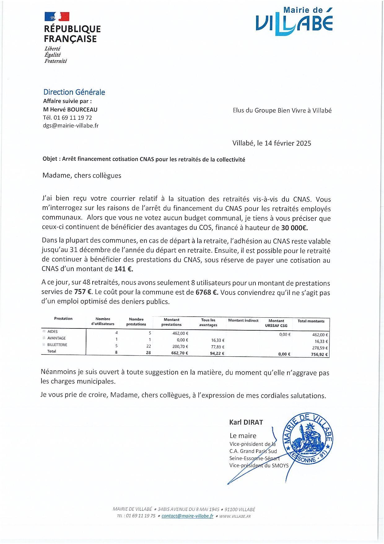 Arrêt du financement cotisation CNAS aux retraités de la collectivité, suite : 27.02.2025