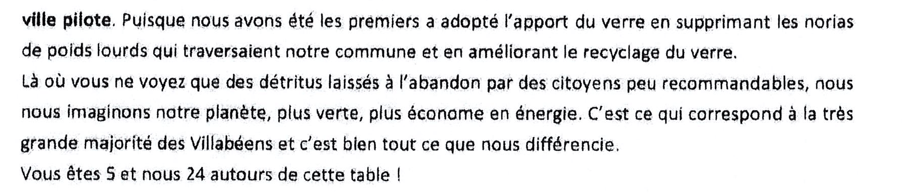 La réponse de monsieur le Maire est en pièce jointe : lisez là et vous constaterez qu’elle est non seulement à la limite du mépris mais aussi à la limite du hors sujet… son seul mérite est d’être claire sur un point : l’équipe majoritaire du conseil municipal a voulu qu’il en soit ainsi ; c’est-à-dire plus de ramassage des verres supprimant ainsi « les norias de poids lourds qui traversaient notre commune » et « en améliorant le recyclage des verres ».