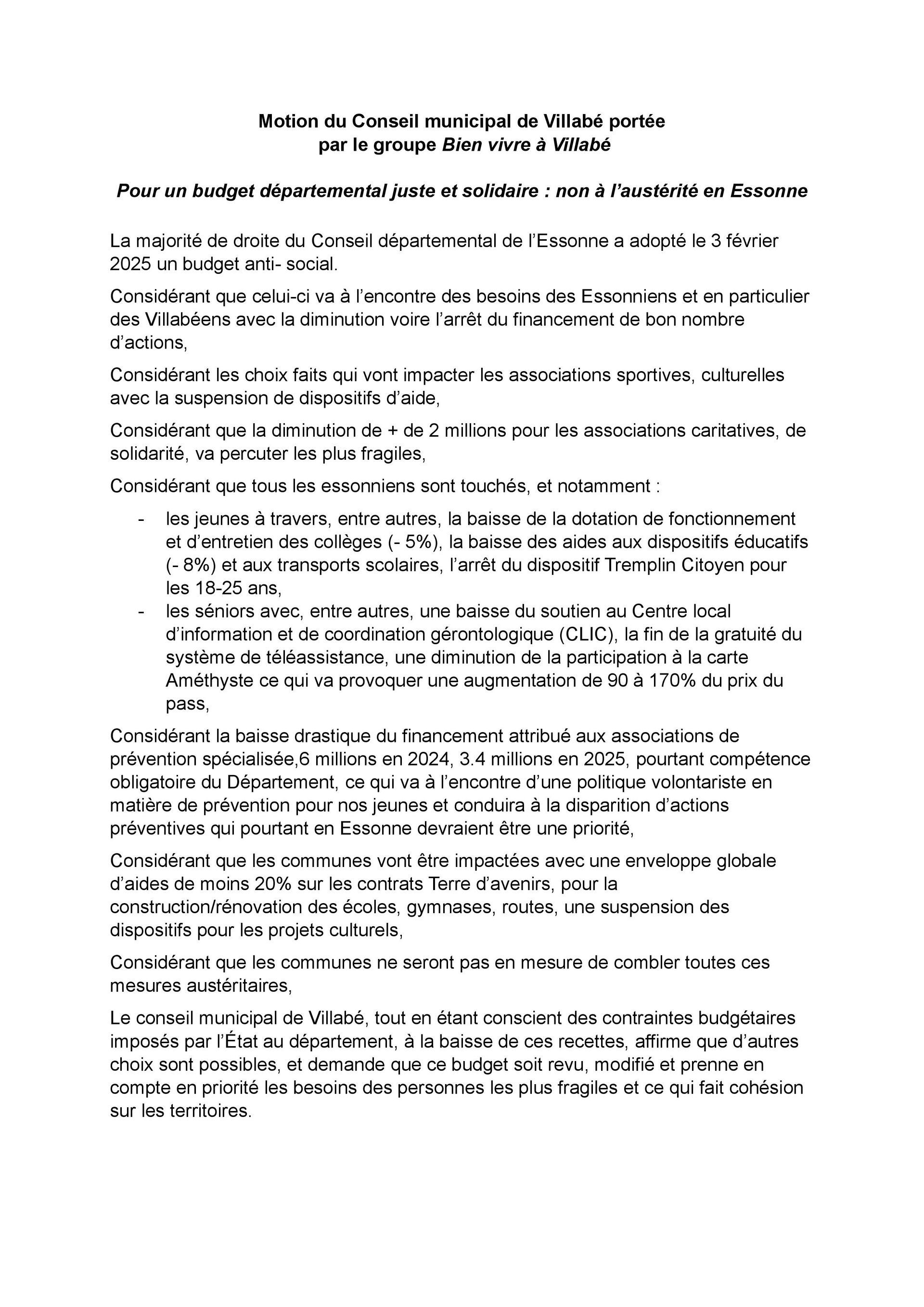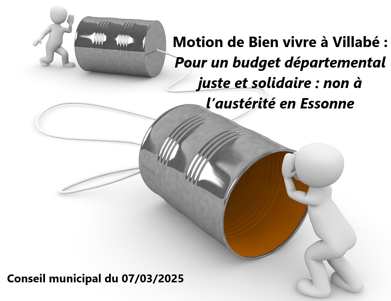 Parce que nous ne pouvons pas rester silencieux sur le budget de casse sociale voté par la majorité de droite du Conseil départemental de l’Essonne et que nous sommes intimement persuadés que d’autres choix sont encore possibles, les conseillers municipaux du groupe Bien vivre à Villabé ont proposé au maire d’inscrire une motion au conseil municipal du 7 mars 2025.