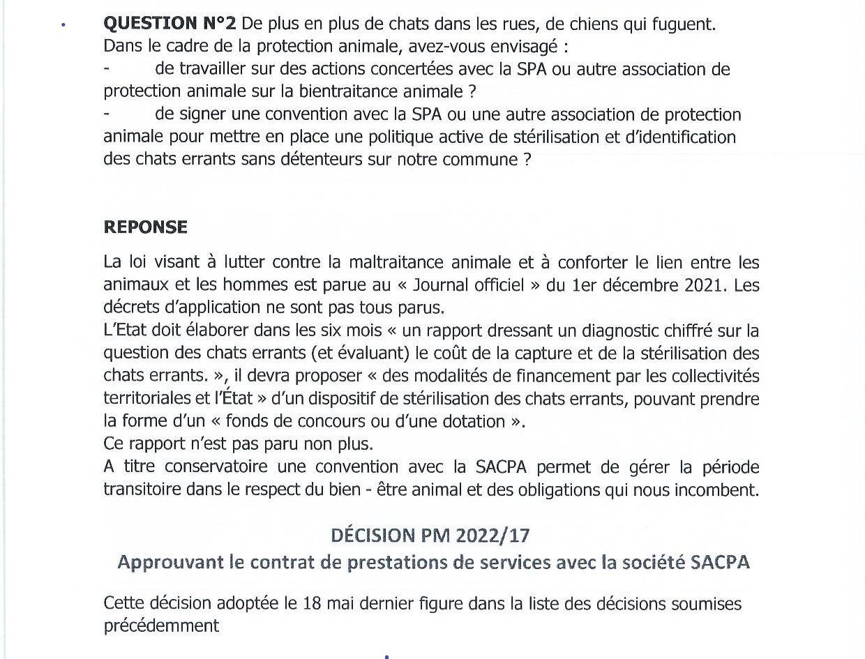 La réponse du maire : il y a une loi, les décrets d’application ne sont pas parus et on est en attente du rapport élaboré par l’état sur le coût et les modalités de financement pour un dispositif de stérilisation des chats errants.