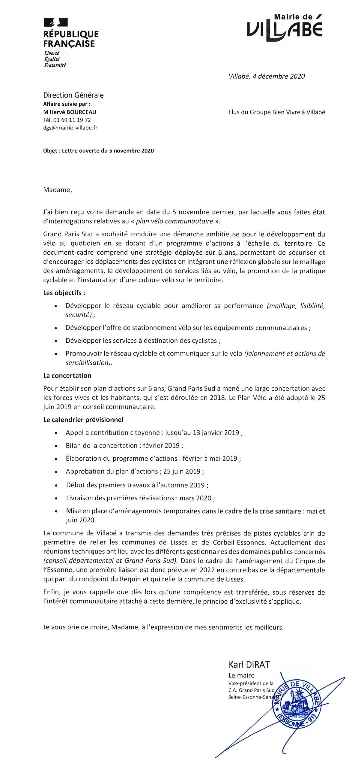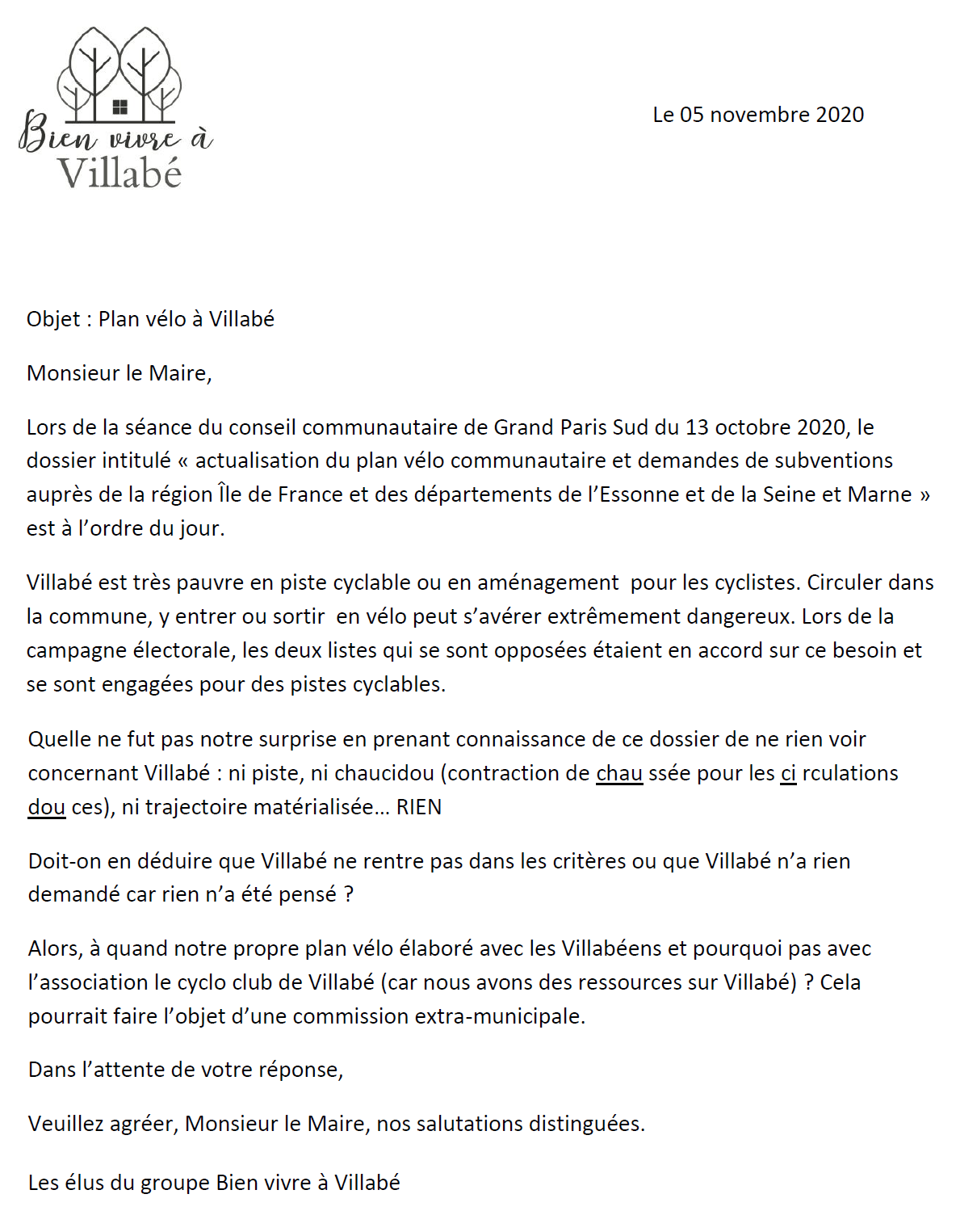 PJ : courrier de Bien vivre à Villabé du 05/11/2020