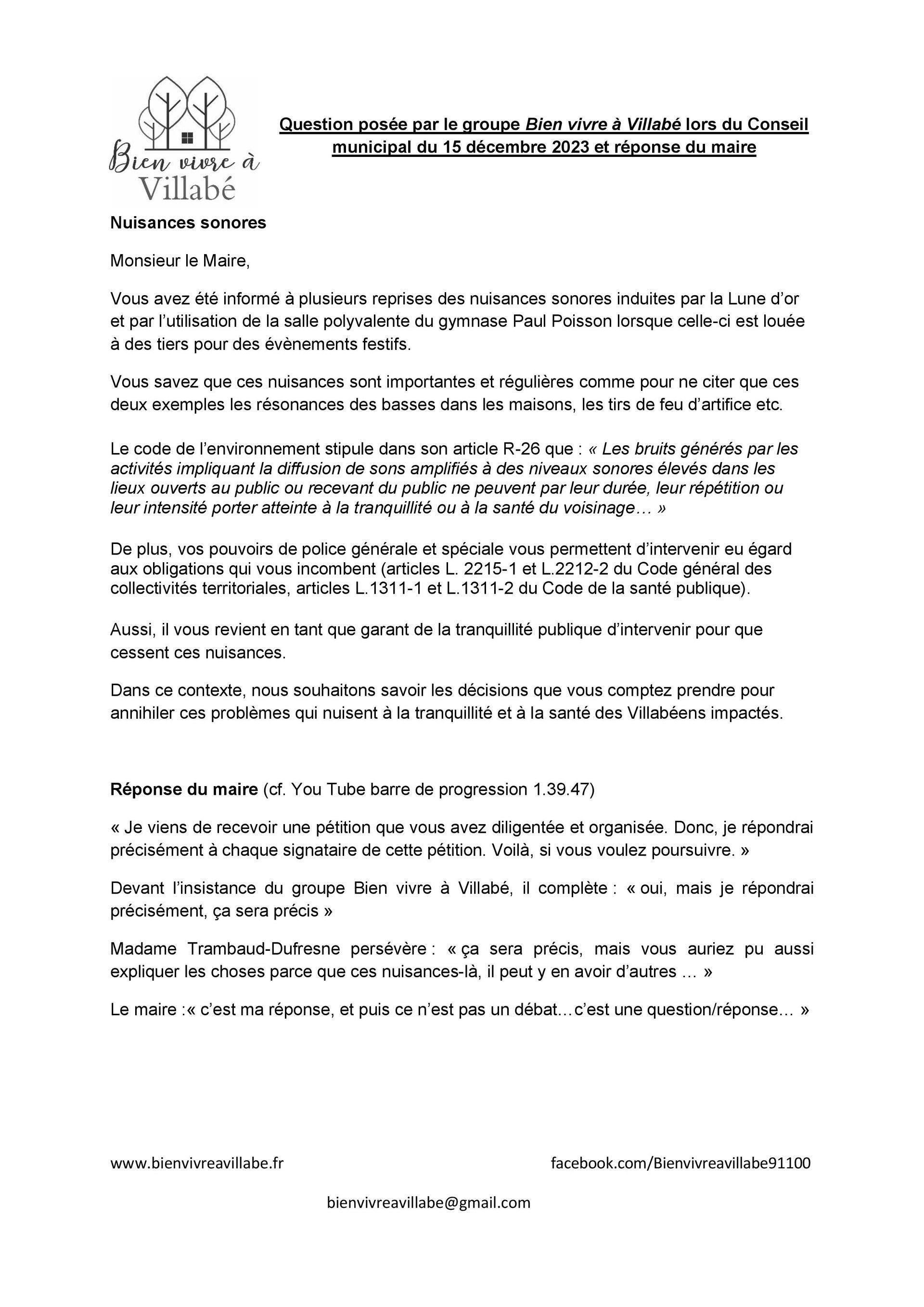 Le groupe Bien vivre à Villabé demande au maire les décisions qu’il compte prendre pour arrêter les nuisances sonores provenant de la Lune d’or et de la salle polyvalente lorsqu’elle est louée, nuisances qui nuisent à la tranquillité et à la santé des Villabéens impactés.