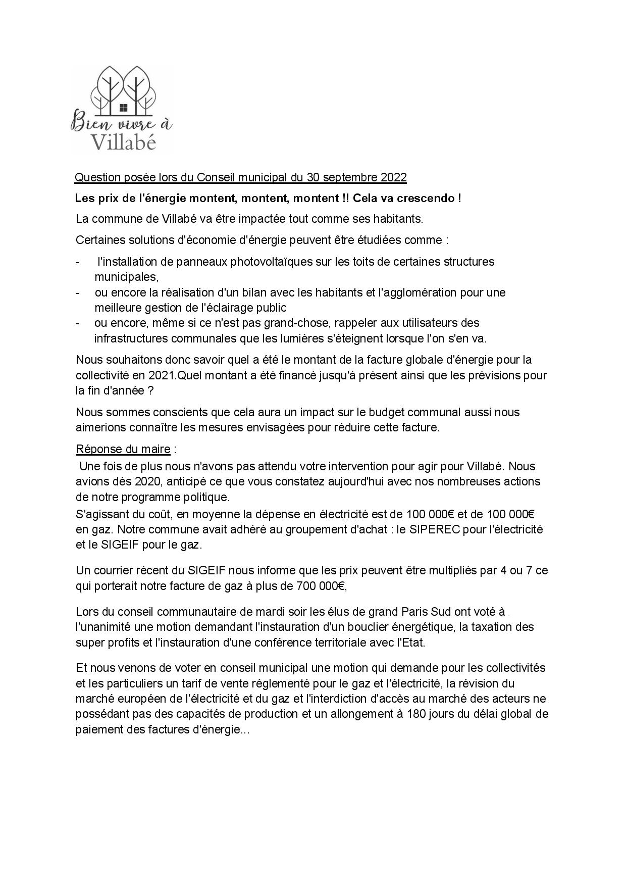 Réponse du maire : « Une fois encore, nous n’avons pas attendu votre intervention pour agir pour Villabé … » mais aucune précision sur les mesures envisagées !!!