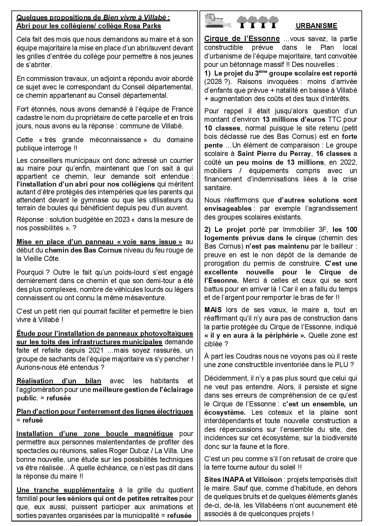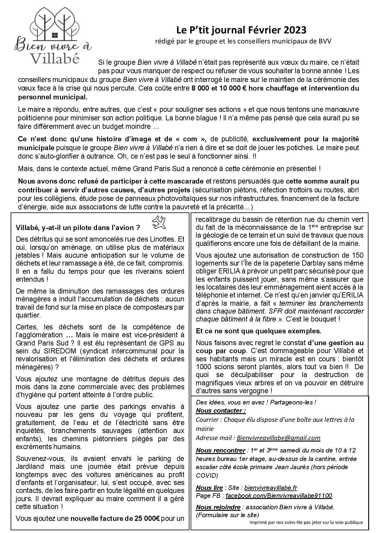 Le P’tit journal Février 2023 du groupe et des conseillers municipaux de Bien vivre à Villabé est en cours de distribution dans vos boîtes aux lettres.