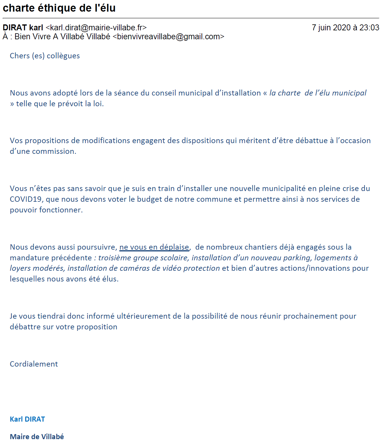 Enthousiastes à l’idée de pouvoir travailler tous ensemble ce beau et noble sujet, nous avons donc adressé ce message à Monsieur le Maire (7 juin 2020 à 22h33):