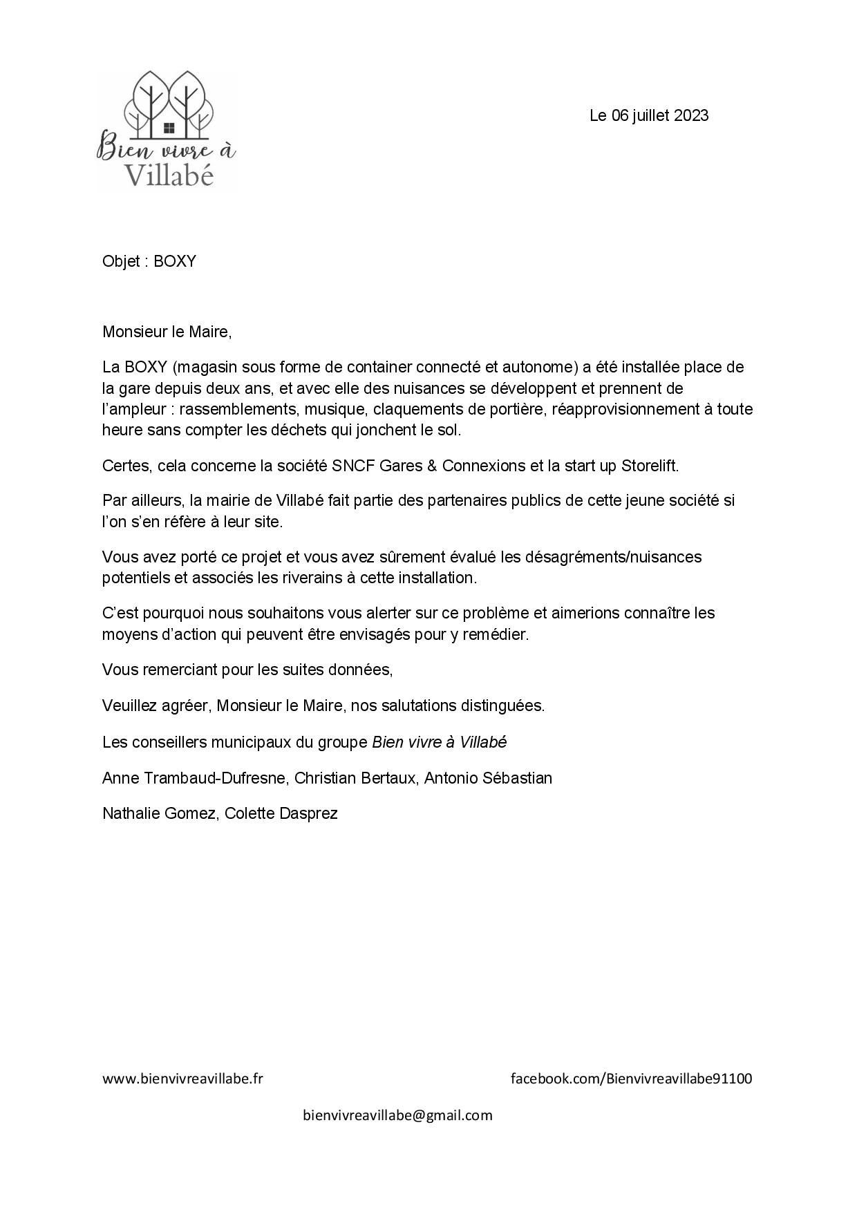 Au vu des nuisances qui se sont développées dans le continuum de cette installation (rassemblements, musique, claquement de portières etc.) les conseillers municipaux de Bien vivre à Villabé ont adressé un courrier au maire pour lui demander quels moyens pouvaient être déployés pour remédier à cette situation.