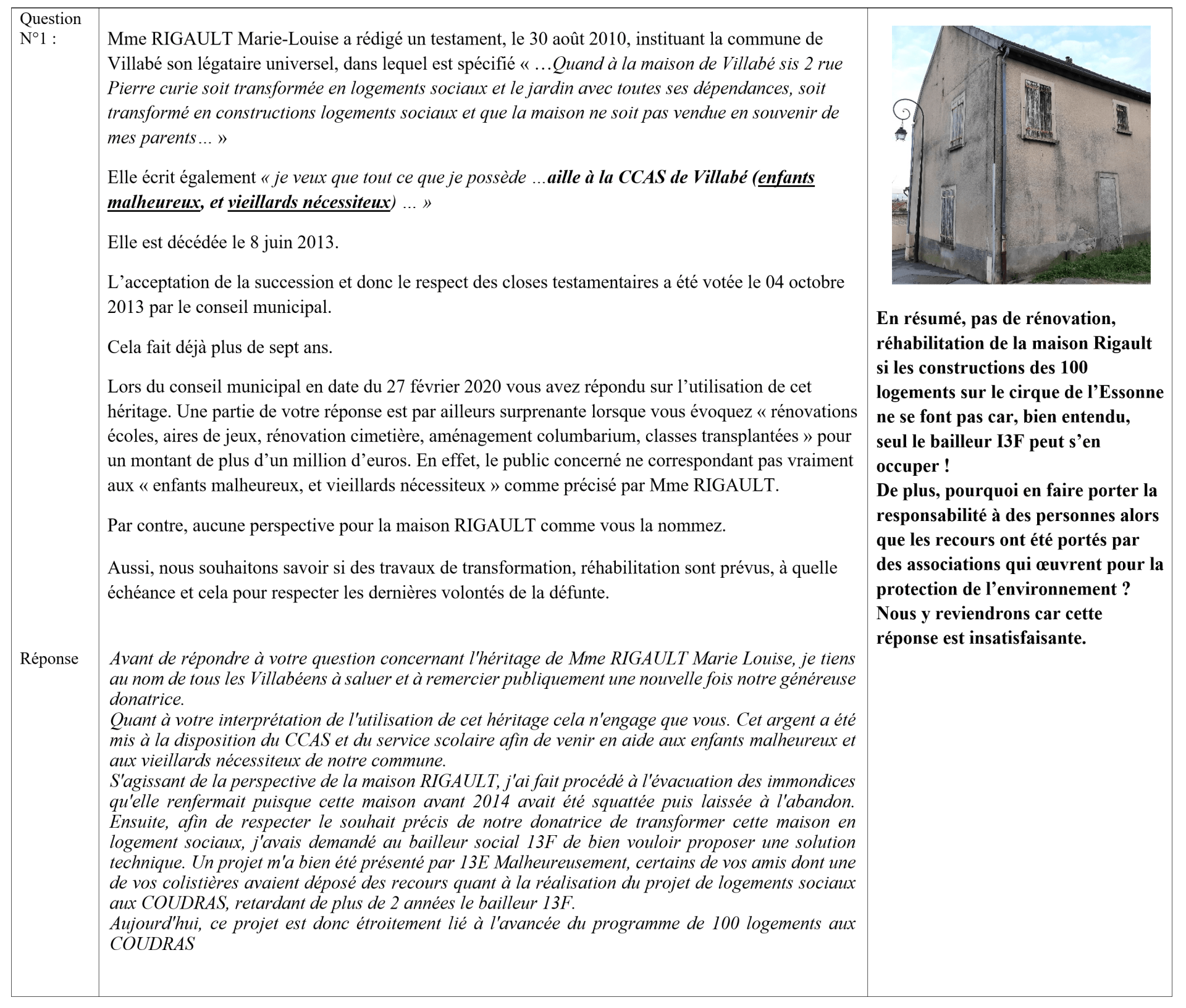 En résumé, pas de rénovation, réhabilitation de la maison Rigault si les constructions des 100 logements sur le cirque de l’Essonne ne se font pas car, bien entendu, seul le bailleur I3F peut s’en occuper !