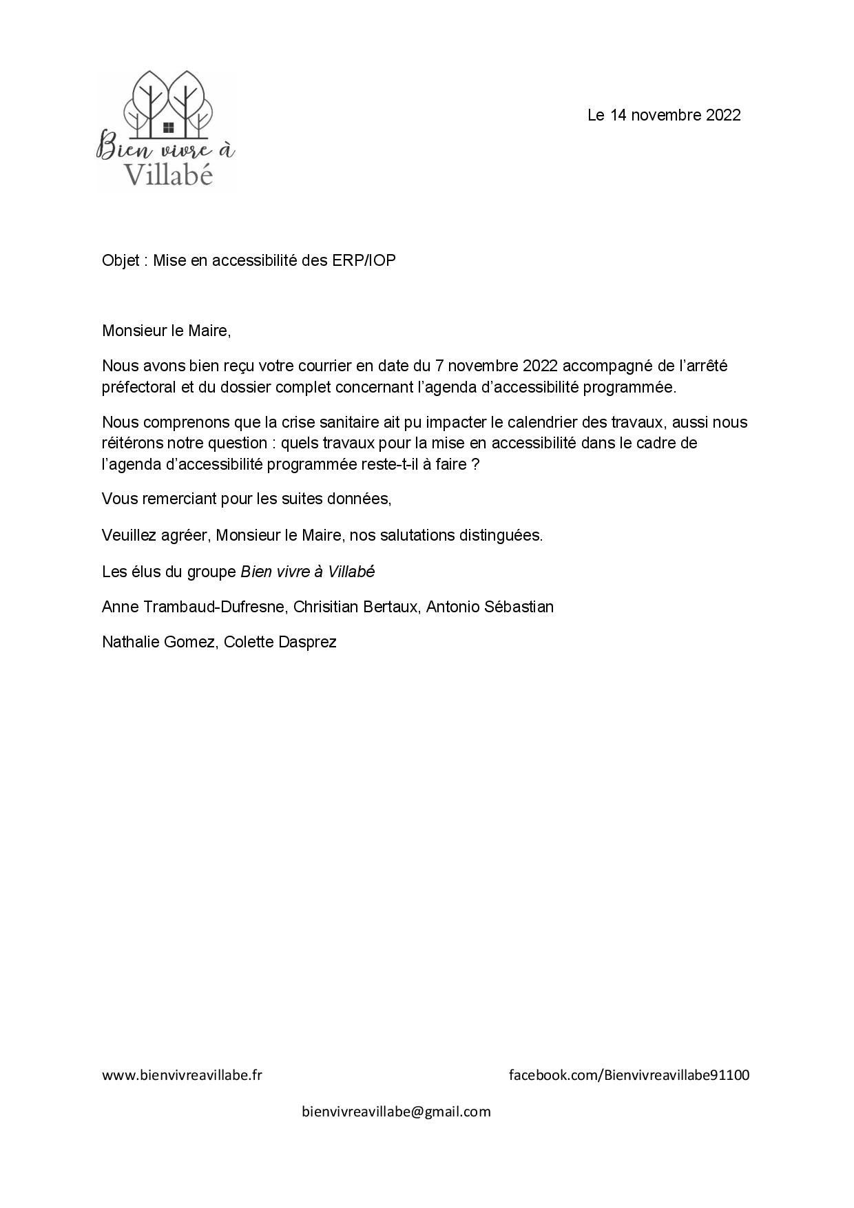 - le 14 novembre, il est demandé quels travaux restent-ils à faire pour être en conformité avec la mise en accessibilité des locaux pour les personnes à mobilité réduite. Le maire de Villabé avait 6 ans à compter du 18 janvier 2017 pour réaliser ces travaux dans le cadre de l’Agenda d’accessibilité programmée validée par le préfet sous peine de sanctions.