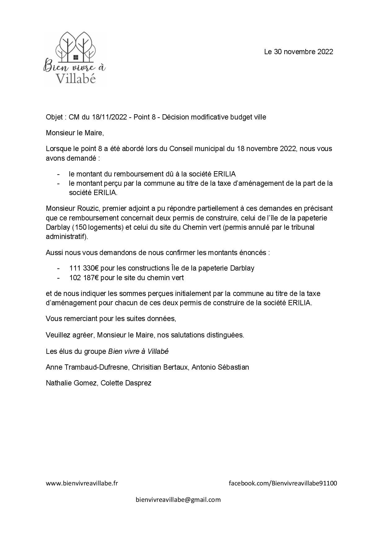 - le 30 novembre, il est demandé que soient confirmés les montants que notre commune doit rembourser à ERILIA au titre d’un montant perçu indûment de la taxe d’aménagement ainsi que la communication des sommes perçues initialement : cela concerne l’île de la papèterie Darblay et le site du chemin vert qui a vu son permis de construire annulé par le tribunal administratif.