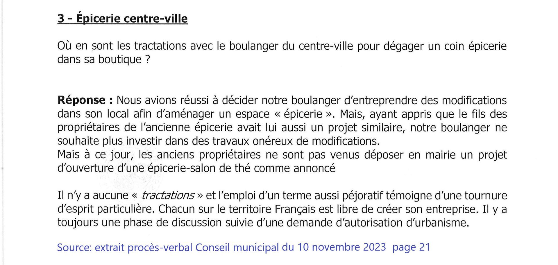 Le maire avait répondu à un de nos courriers en août 2023 « nous travaillons d’ailleurs actuellement avec notre boulanger à la réouverture d’une épicerie tant attendue, place Roland Vincent » ; en réunion publique, il a pu l’annoncer comme imminent.