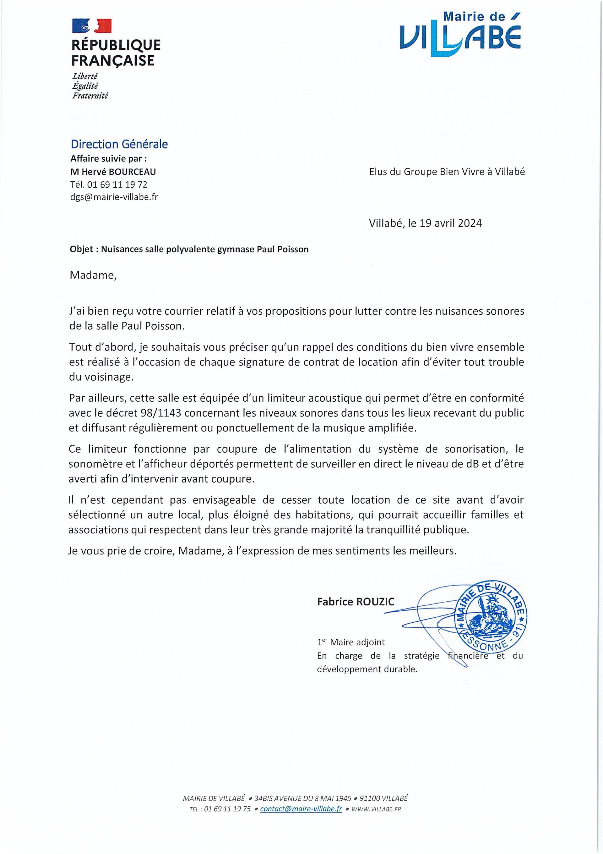Il précise que le nécessaire a été fait avec la pose d’un « limiteur acoustique » : c’est très bien et cet élément a déjà été communiqué en conseil municipal aux conseillers municipaux de Bien vivre à Villabé.