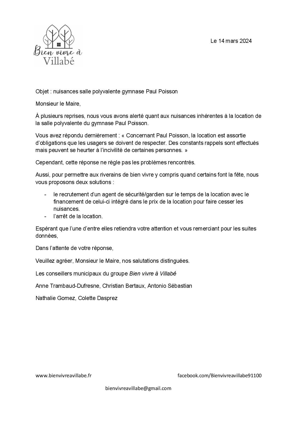 Fidèles à nos engagements, nous avons adressé un courrier au maire le 14 mars 2024 et lui avons proposé deux solutions pour permettre aux riverains de bien vivre y compris quand certains font la fête :
