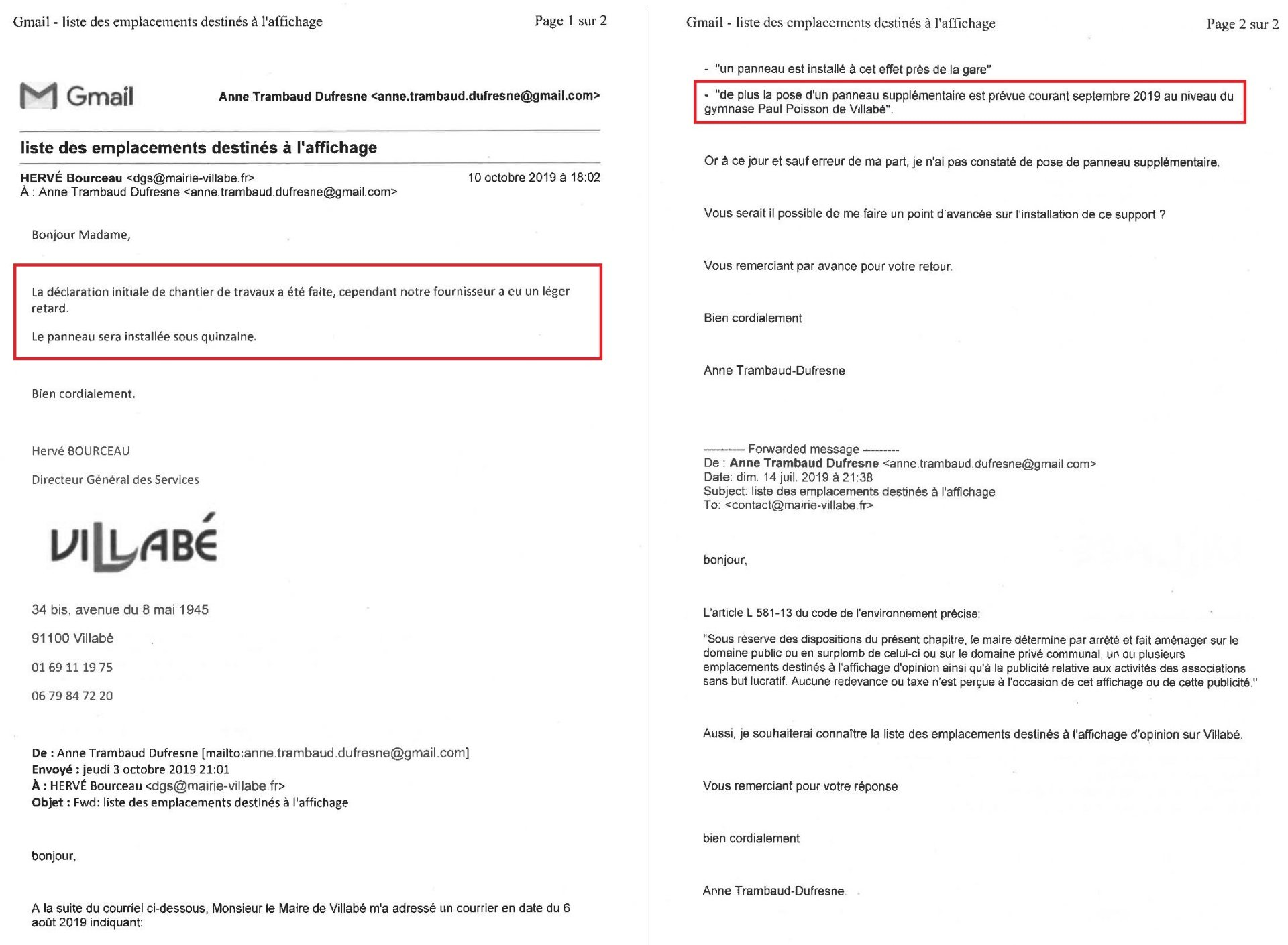PJ 1 : Échange de mails entre la Mairie et Anne TRAMBAUD-DUFRESNE