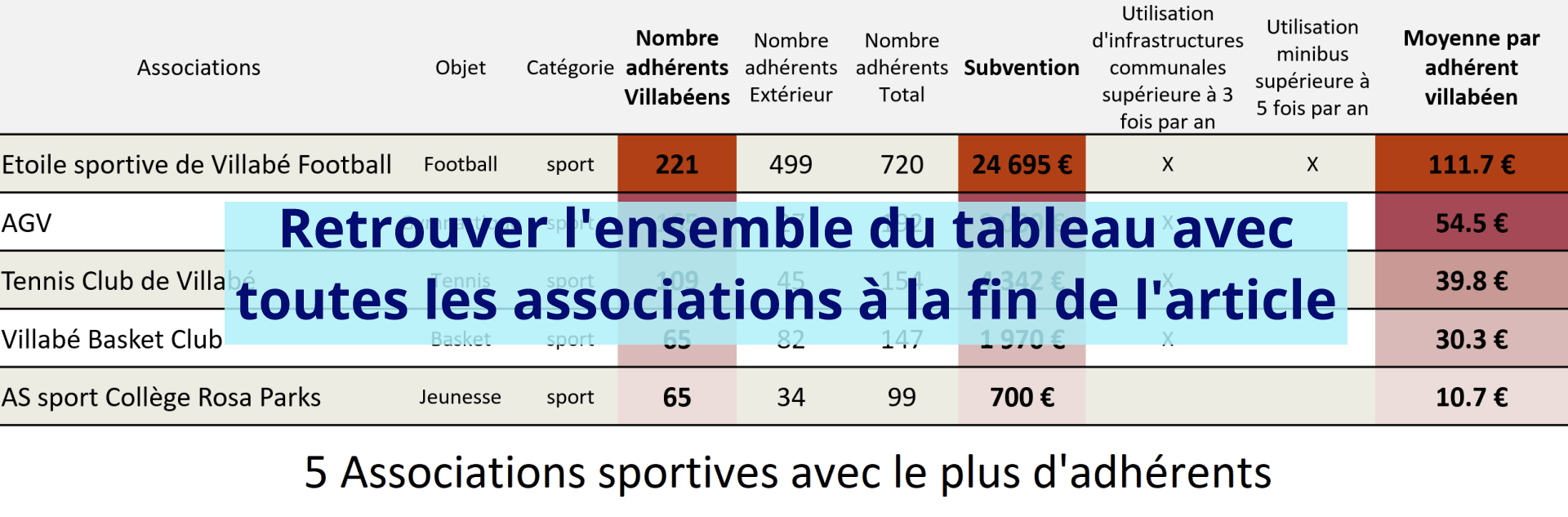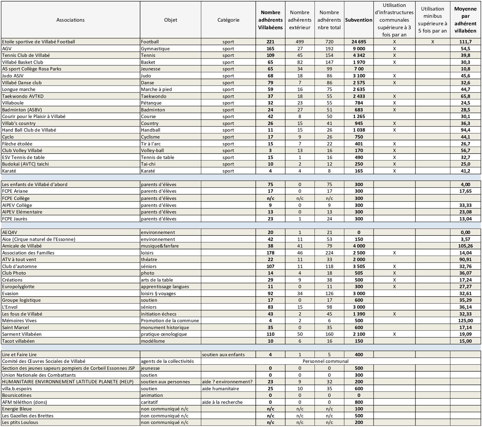 Nous avons construit un tableau simple qui reprend l’ensemble des éléments transmis par la mairie. Nous avons calculé le montant moyen attribué par adhérent villabéen (sont exclus du calcul les adhérents extérieurs et l’utilisation des minibus/locaux n’est pas valorisée)