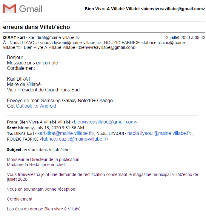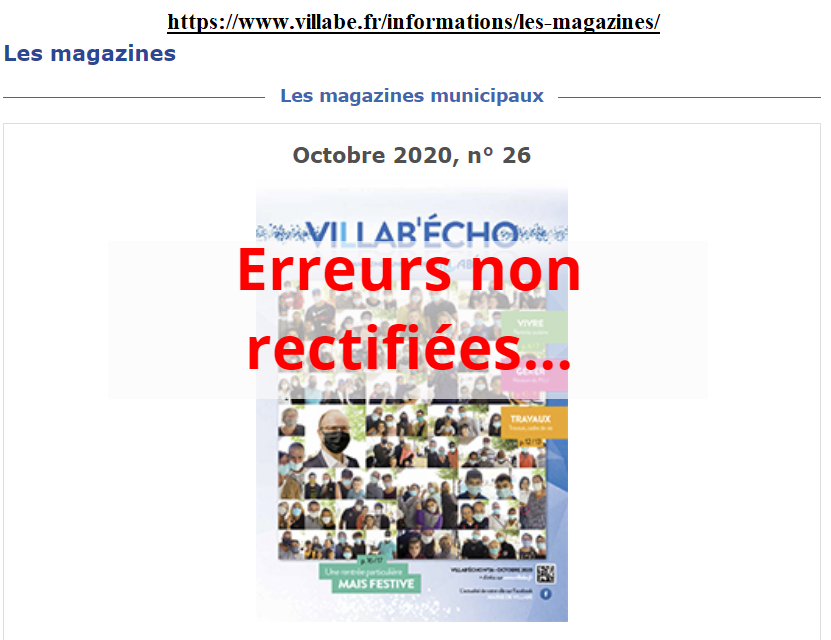 Dans le magazine municipal de juillet 2020, nous avions relevé 2 erreurs : un courrier avait alors été transmis à monsieur le Directeur de publication (monsieur le Maire) et madame la rédactrice en chef (l’adjointe en charge de la communication) - voir document joint