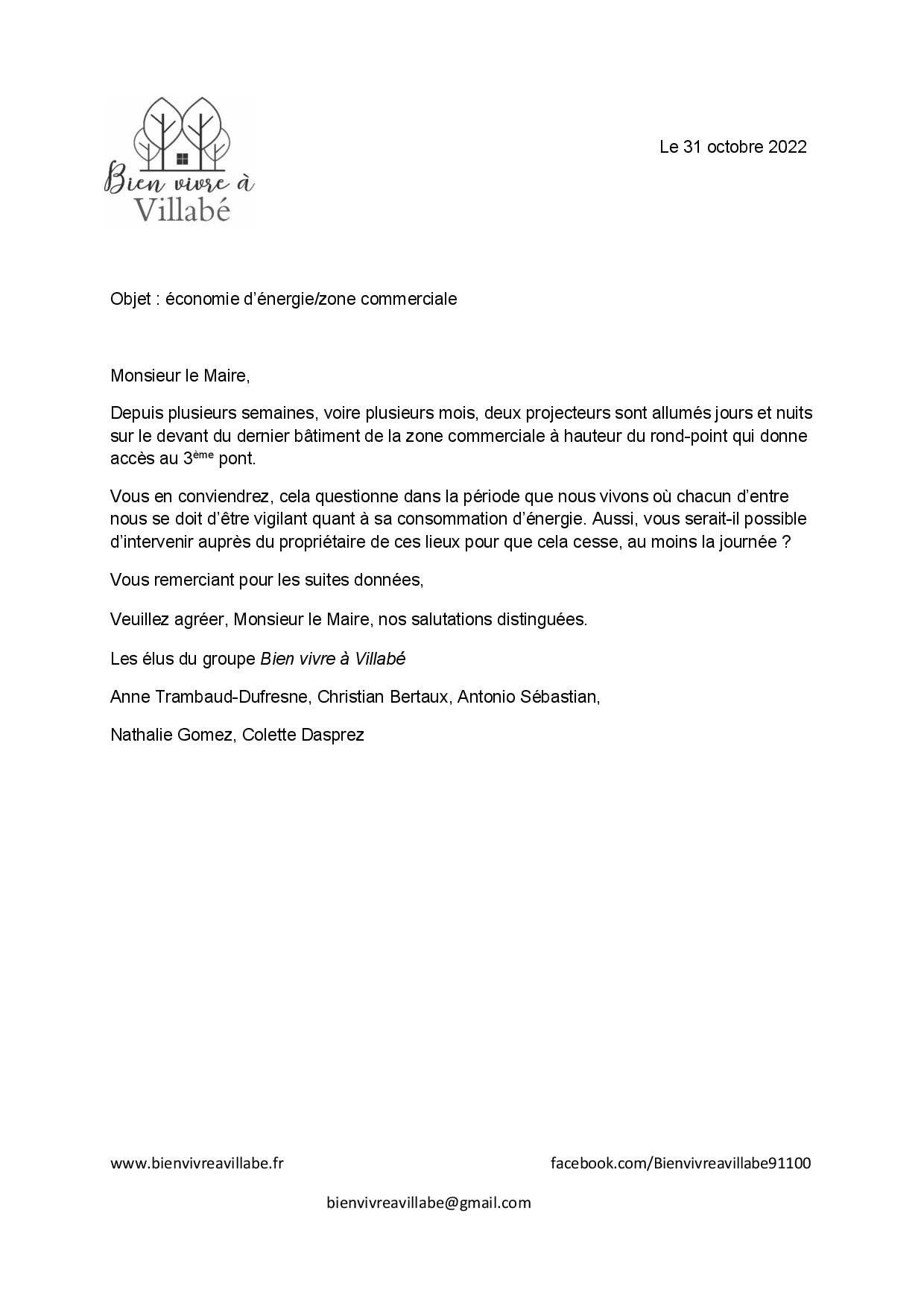 Une question simple au maire : deux projecteurs sont allumés jour et nuit sur le devant du dernier bâtiment de la zone commerciale à hauteur du rond-point qui donne accès au 3ème pont. Nous avons donc demandé son intervention auprès du propriétaire de ses lieux pour que cela cesse au moins la journée.