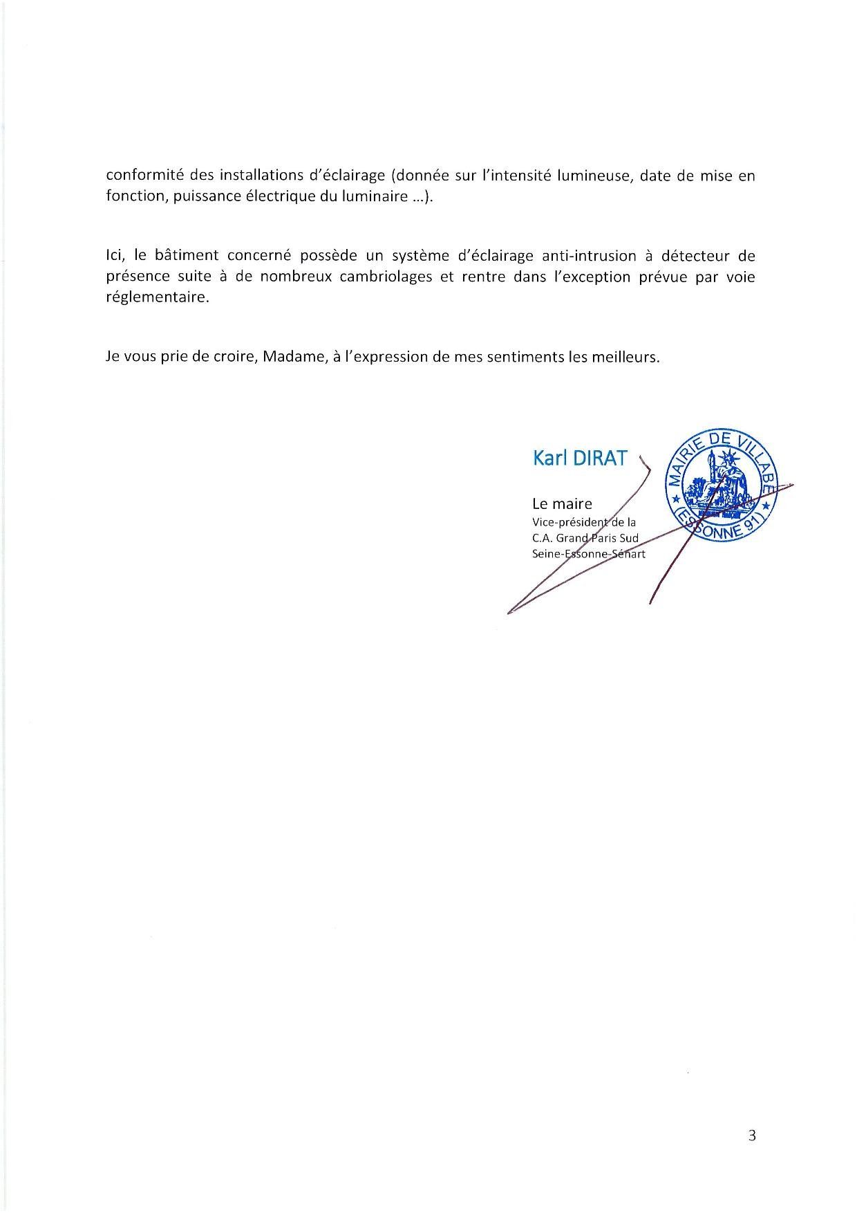 Réponse du maire : « …système d’éclairage anti-intrusion à détecteur de présence suite à de nombreux cambriolages et rentre dans l’exception prévue par voie règlementaire … » ??